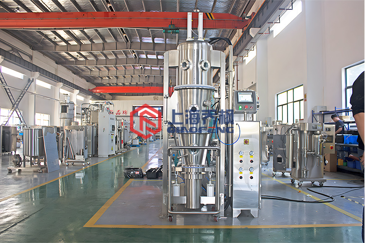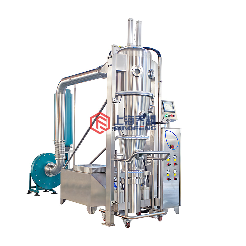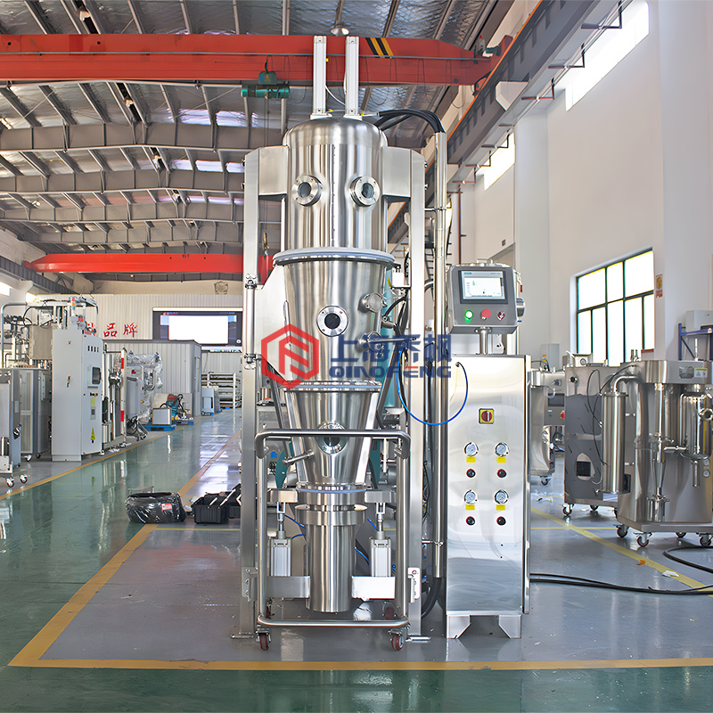 將制粒用粉末或包衣用顆粒(粉)物料投入流化床內,冷空氣從主機后部加熱室進入,經初效.中效過濾.加熱器加熱至進風所需溫度后進入流化床,粉末(顆粒)在床內呈流態化,制粒用粘結劑由輸液泵送入雙流體霧化器,經霧化后噴向流化的物料。掩味、防潮、防氧化、防水、隔熱、著色、隔離包衣。